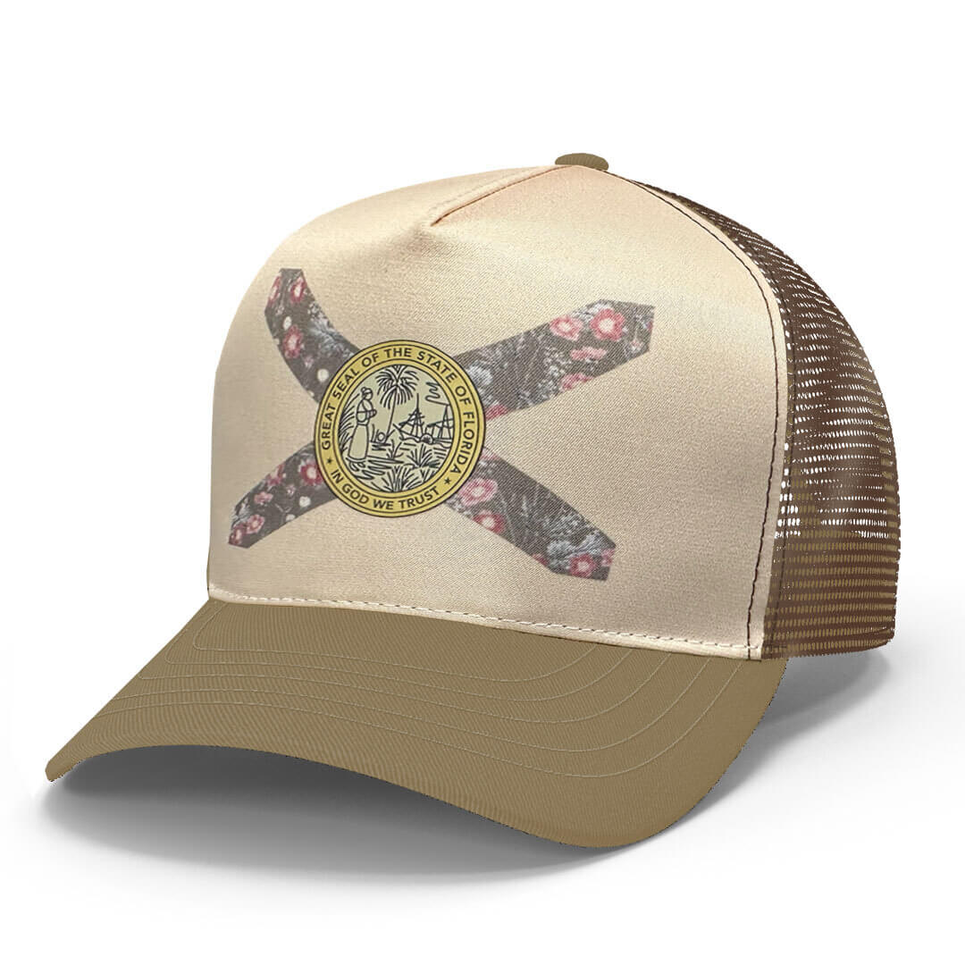 Elevate your style with the "Flo Flower Women's Hat" designed for women. Its charming design effortlessly blends the Florida flag with a delicate floral touch, capturing the essence of Sunshine State beauty. With a convenient snapback, curved bill, and breathable mesh back, this hat isn't just headwear—it's a statement of your love for Florida's elegance.