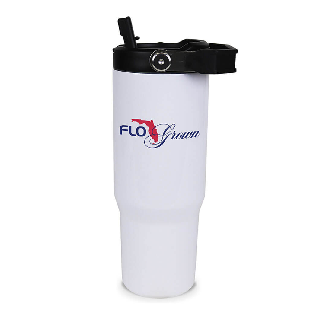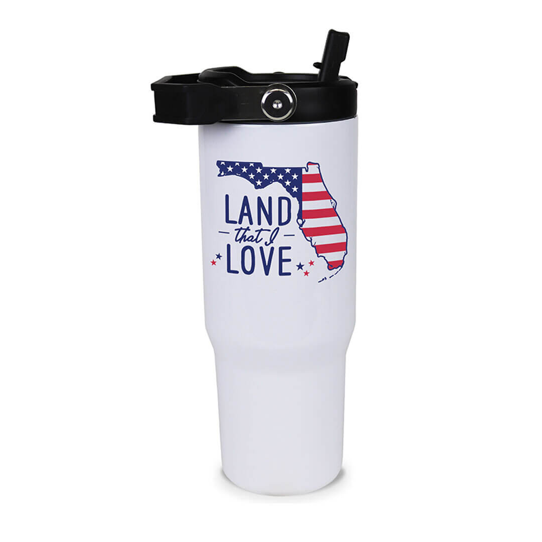Love for our great state and country is featured on this sleek, modern vessel. This 30-oz tumbler has double-wall, 18.8 stainless steel for optimal temperature retention. It has a wide mouth for easy cleaning, a threaded lid with flip up drink-through straw, and convenient carrying handle.