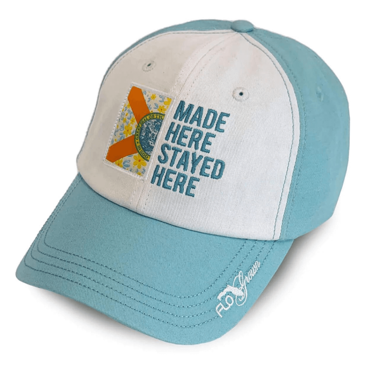 Elevate your style with the "Made Here Floral Women's Hat" designed exclusively for women. Its captivating design proudly features "made here stayed here" script and a Florida flag patch adorned with a floral backdrop, symbolizing your deep-rooted Florida connection. With an adjustable back and curved bill, this hat isn't just fashion—it's a declaration of your Florida pride and style.