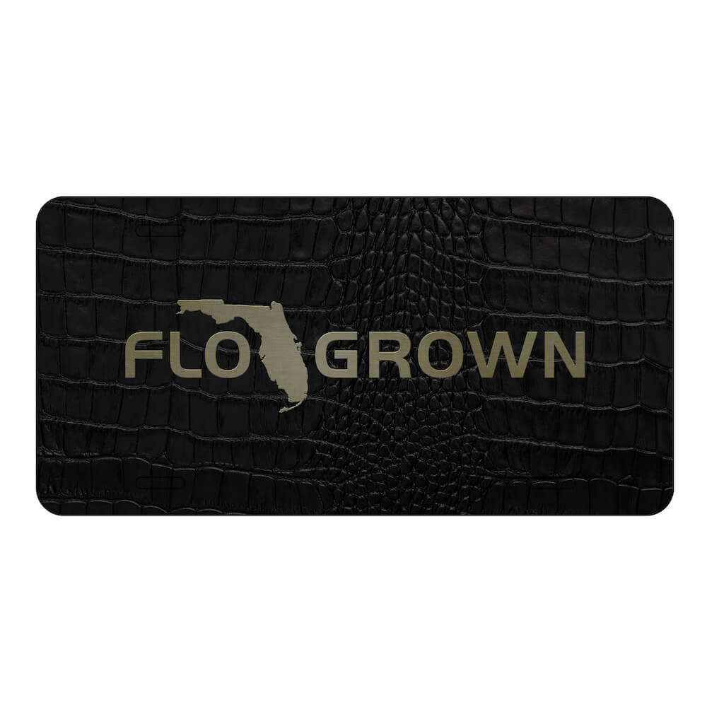 The "Midnight Gator License Plate" is the perfect addition to any adult's vehicle. With its unique gator skin design and prominent FloGrown logo, it adds a touch of rugged style to your front car license plate.