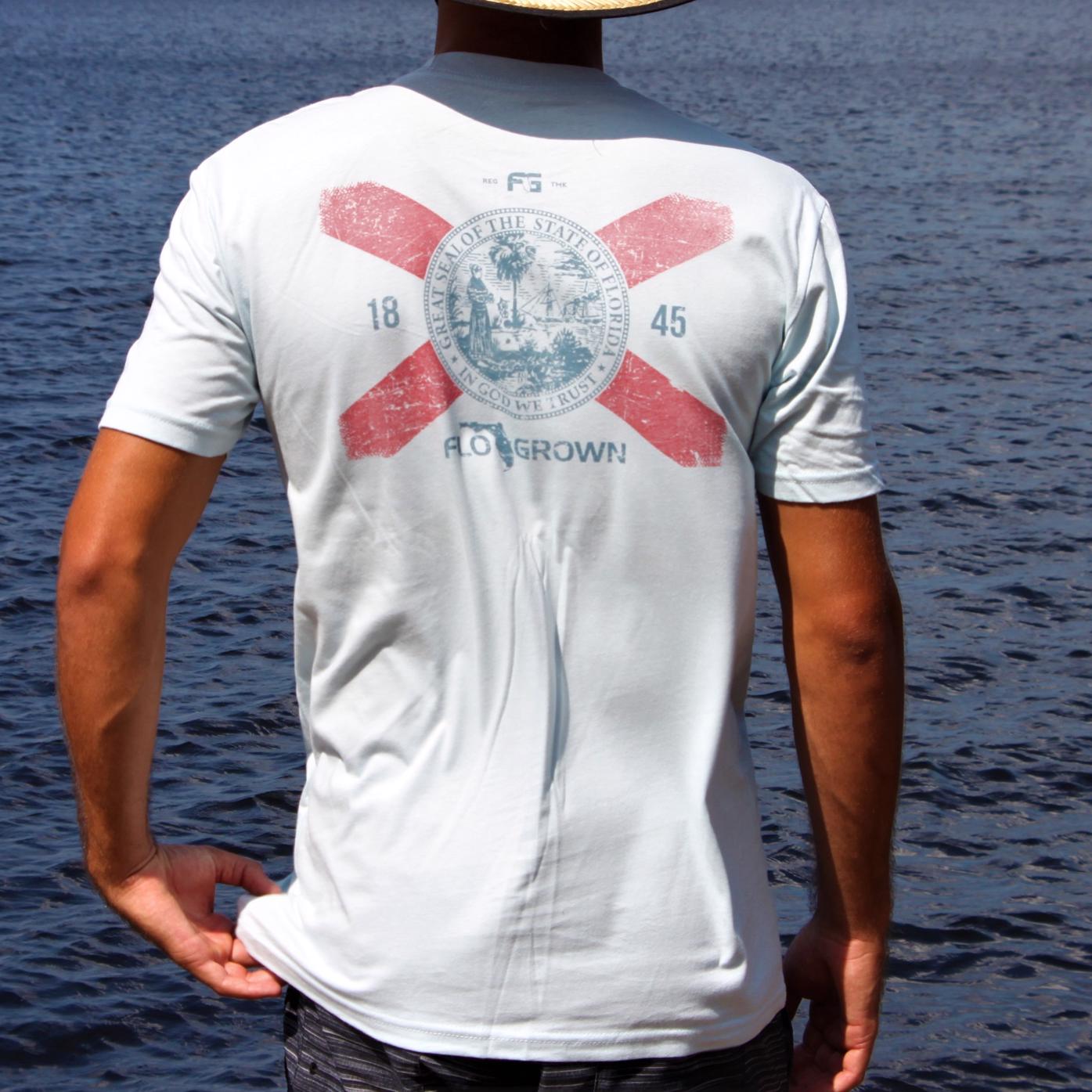 A washed out Florida cross and seal sit on the back of this athletic fit Scratch Flag Tee. With the Flogrown logo and Florida establishment year, this original design is not one to miss. Due to popular demand, this design is also available in a youth long sleeve tee!