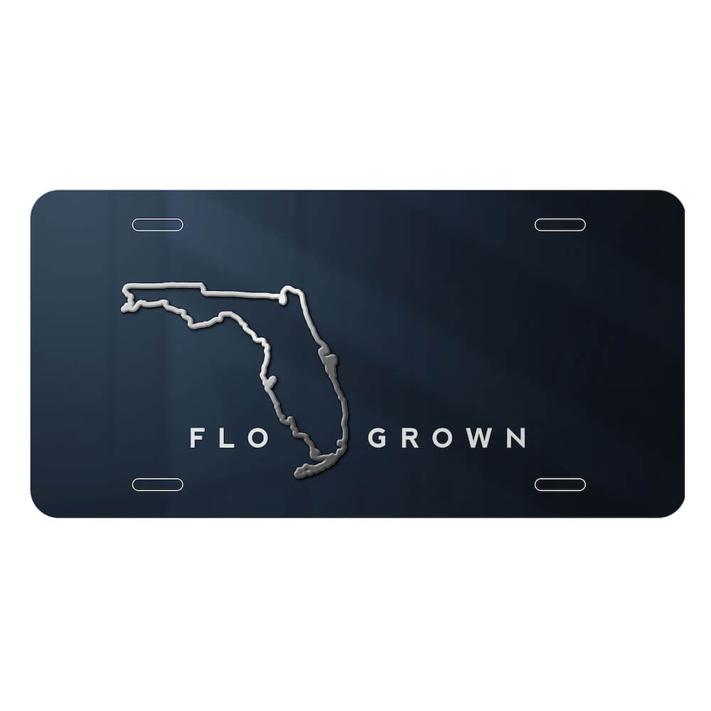 The "Golden Sunset License Plate" is a stylish front car license plate designed for adults. It features a captivating blue/navy gradient with the outline of the state of Florida and the iconic FloGrown logo, adding a touch of Sunshine State charm to any vehicle.