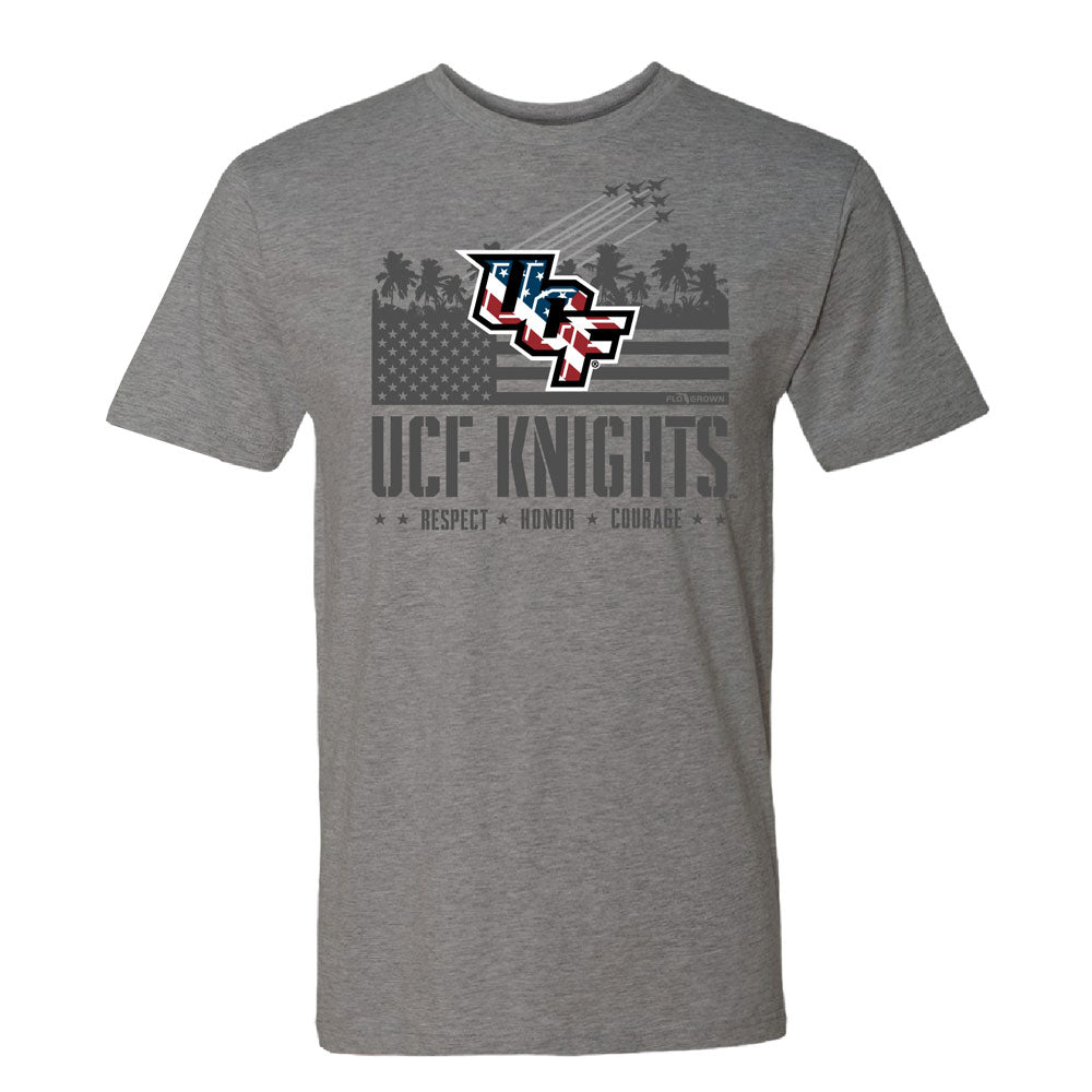 The "UCF Knights Fly Over Tee" seamlessly fuses patriotic pride with sports allegiance. Tailored for men who embrace the outdoor lifestyle, its design revolves around a military theme. The shirt boasts the UCF Knights logo, enhanced by the powerful imagery of military jets soaring above the American flag. This tee isn't just clothing; it's a salute to heroes, both on fields and in skies.
