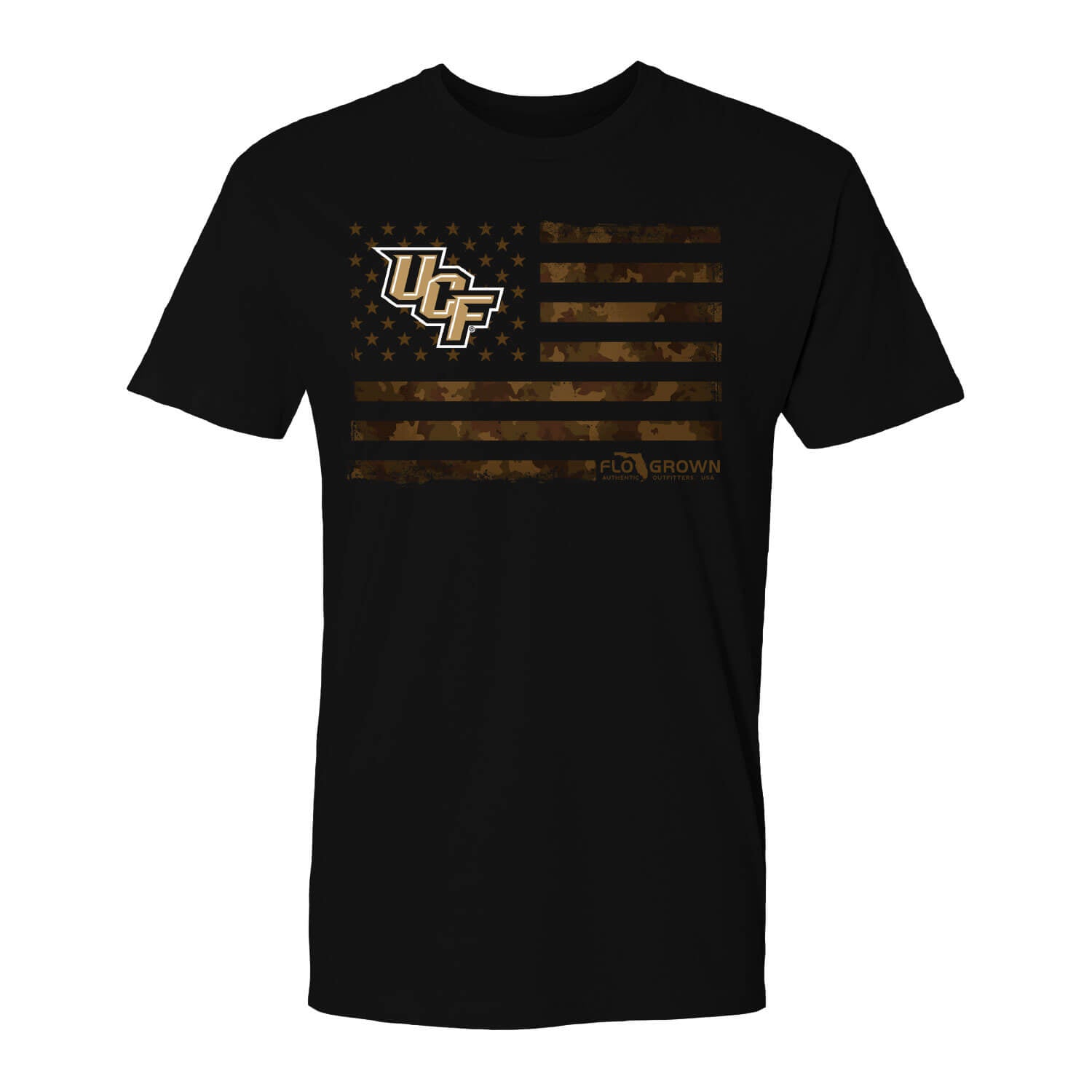 Elevate your style with the "UCF Knights US Camo Flag Color Tee." Designed for men, it boasts a striking UCF logo on a camouflage USA flag background. Perfect for leisure wear with its front print. Upgrade your wardrobe today!